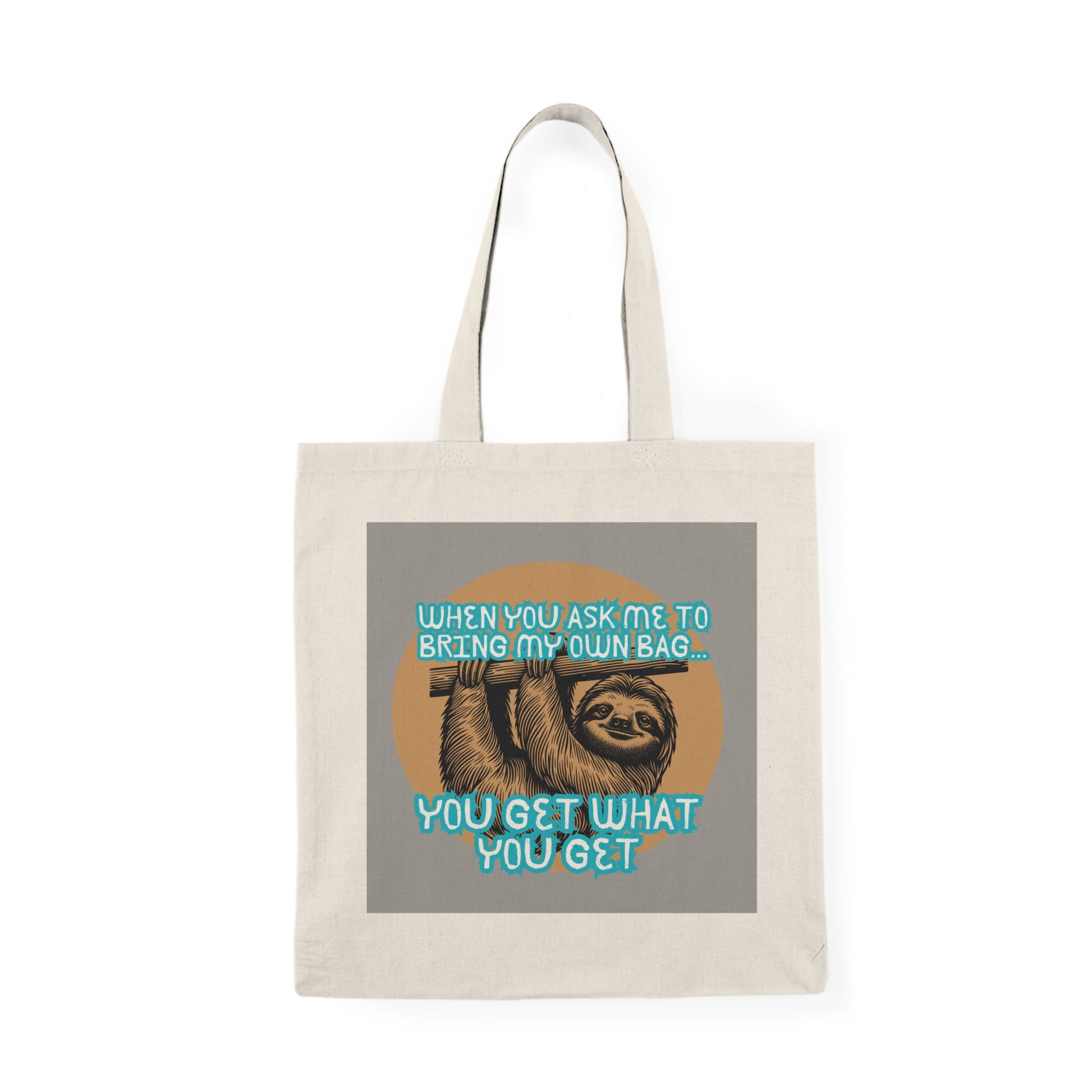 Funny sloth design on a natural cotton canvas tote bag, perfect for eco-conscious shoppers with a sense of humor. Ideal for those who enjoy adding a touch of fun to their everyday errands or grocery shopping. Relevant for Earth Day, grocery shopping trips, and casual outings.