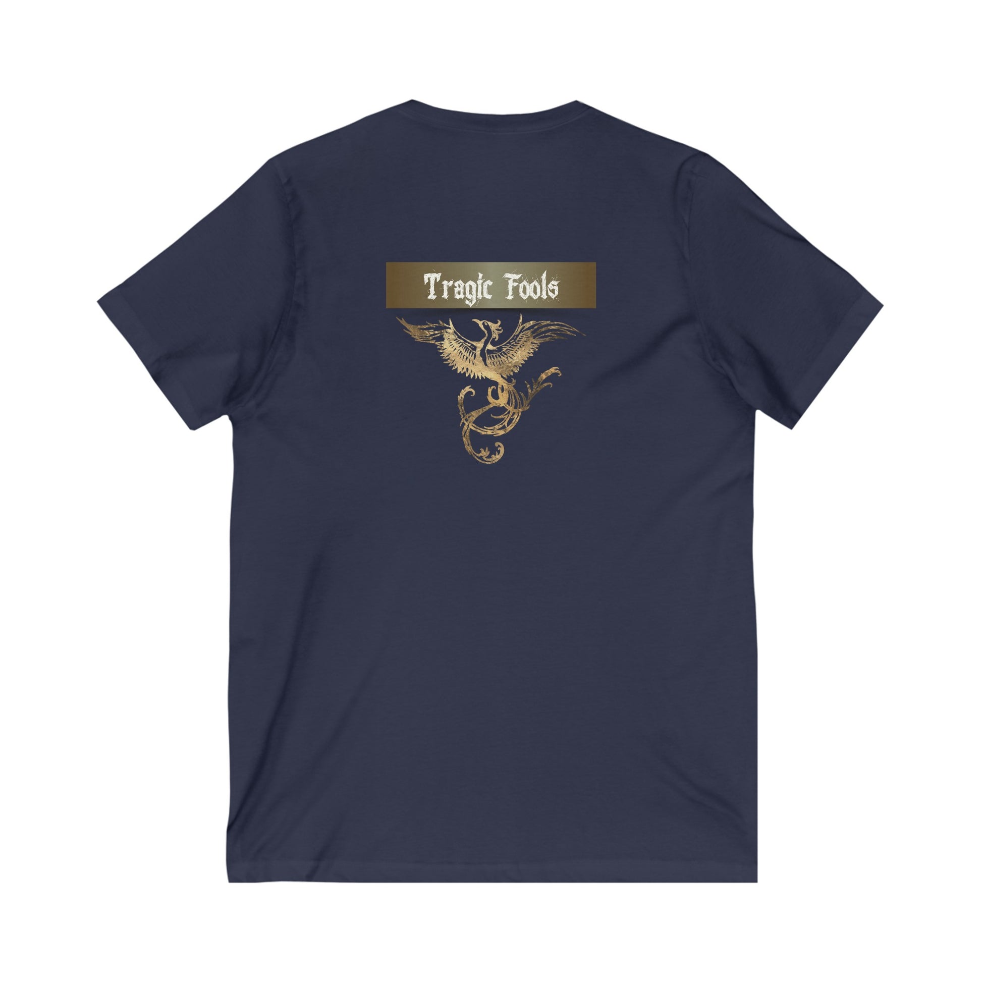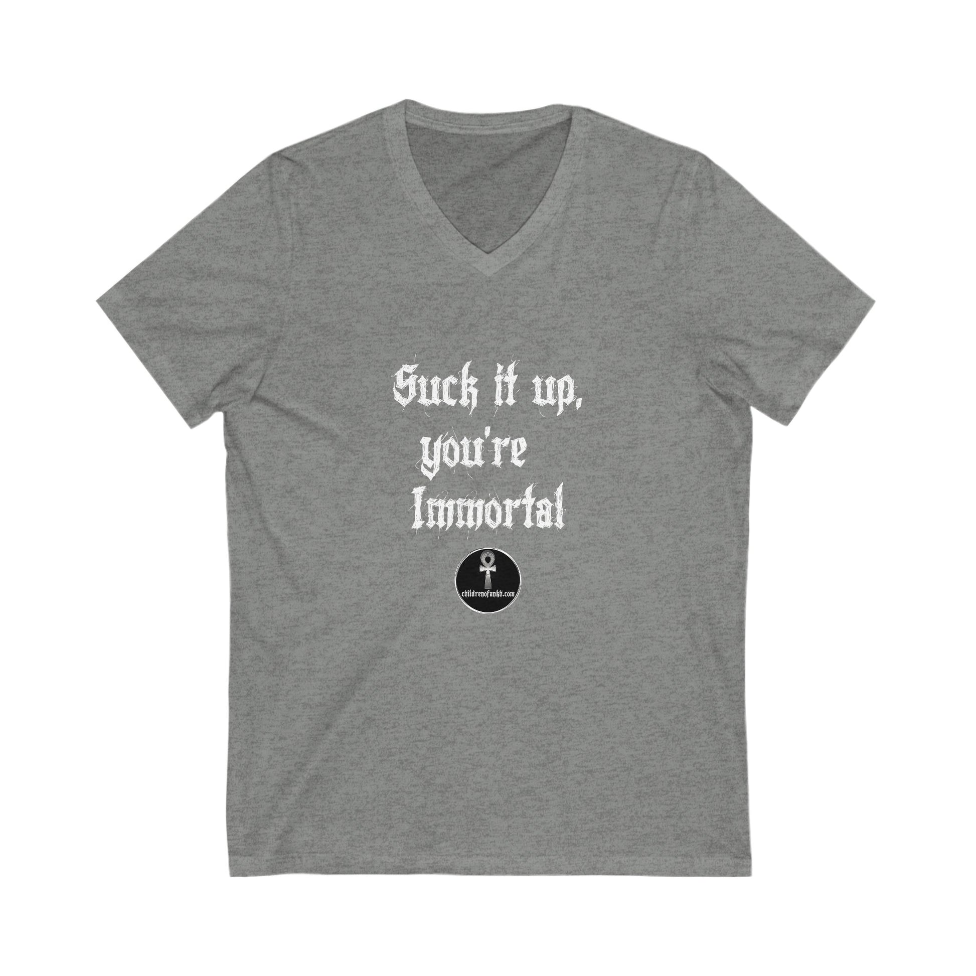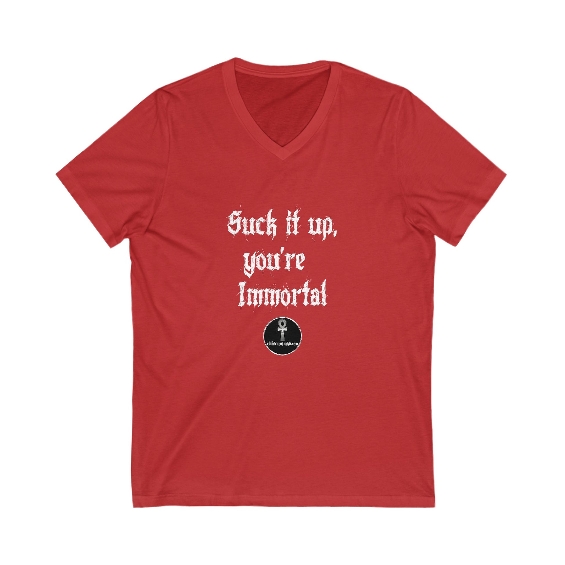 Unisex Jersey Short Sleeve V-Neck Tee COA Universe, Suck it up You're immortal on the front. Tragic Fools on the back
